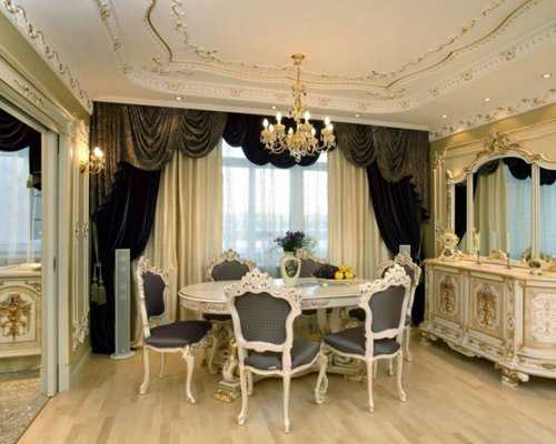 Непременным атрибутом классики является большое количество декора. Гипсовая лепнина, резьба, ковка, керамика, драпировка на шторах — все это украшает интерьер, придавая ему торжественный вид.