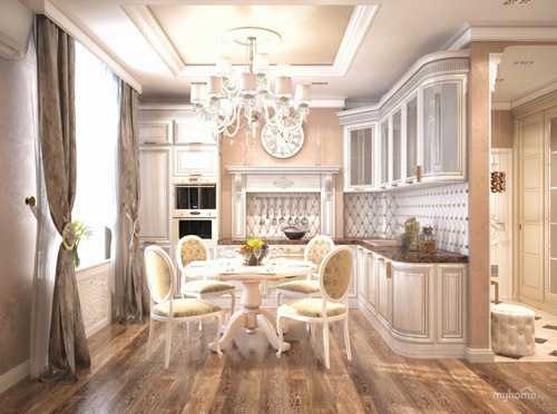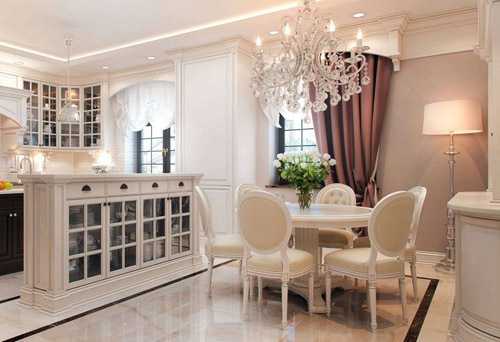 Очень часто в классическом стиле кухня объединена со столовой или гостиной, так как в современном жилье разделение гостиных и столовых встречается редко. В основном для создания более легкой свободной атмосферы используется бело-золотая гамма.
