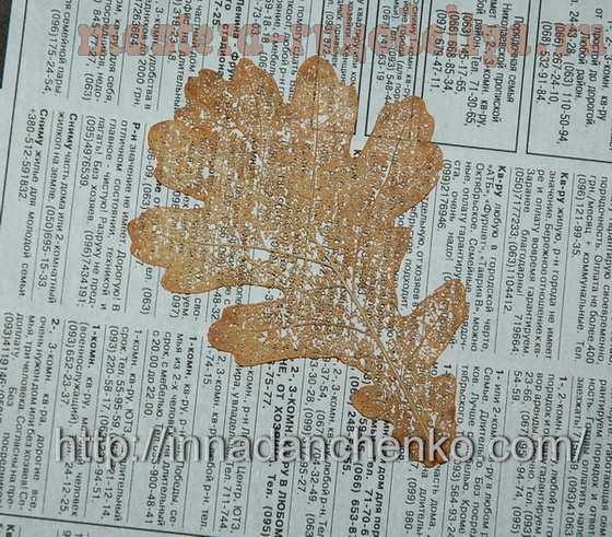 Берем очень свежие листья, без пятнышек и дырочек, раскладываем на газетке и бьем по ним щеткой. Мягкие ткани листа вы разобьете, останутся одни прожилки или скелет листика! Способ идеален для листьев клена, явора, фикуса Бенджамина, тополя, плюща и т.д.