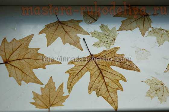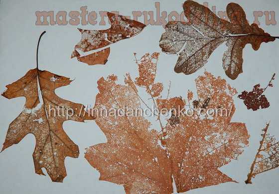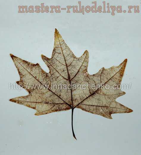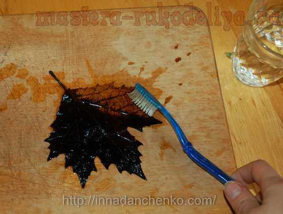Можно взять и высушенные под прессом листья. В таком случае у вас получится не скелетированный листик, а просто ажурный – тоже интересный вариант. И тут как раз щетка может быть не очень жесткой.