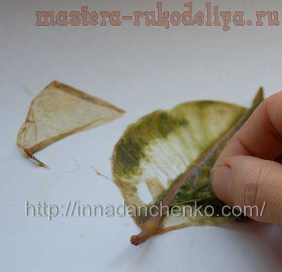 Скелетирование листьев — это когда от листа остаются одни прожилки, и лист становится необычно прозрачным. Для этого используются только твердые листья. Листья фикуса, манго, мандарина и т. д. Главное, не брать листья, слишком напитанные водой — такие, как каланхоэ.