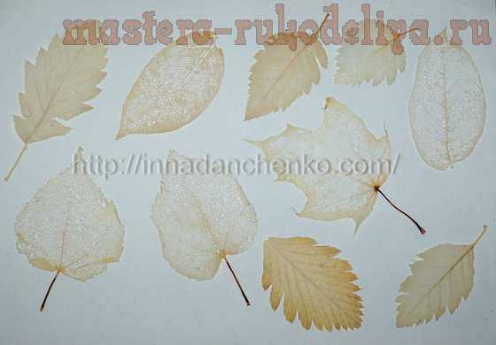 Чтобы листья стали белыми и прозрачными, нужно их залить водой пополам с отбеливателем («Белизна» подойдет). Ждете минут 10-15 (смотря какие листья обрабатываете). Как побелеют – вытаскиваете, промываете под проточной водой. Получаете белый прозрачный лист.