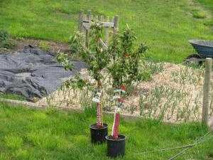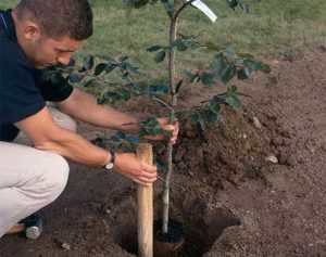 Если для однолетних саженцев опора не обязательна, то для двухлетних и более старших деревьев следует предварительно укрепить в дне ямы вертикальные опорные колышки, с помощью которых фиксируется ствол растения (спустя 3 — 4 дня, когда осядет грунт). Для однолетних саженцев при осенней посадке создается защита от холодов и ветровой нагрузки в виде земляного холмика, насыпанного вокруг ствола до высоты 30 см.