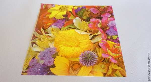 Теперь, сделаем самостоятельно красивые фоны. Вырезаем из салфетки самый красивый кусочек, размером, не больше основы для открытки. Если у Вас стандартная салфетка 33/33 см, — достаточно 1/4 части, или меньше, смотря по Вашей задумке декора. Отделяем верхний слой салфетки от дополнительных слоев, при этом, смотрите внимательно: салфетки бывают 2-х, 3-х и 4- слойные. Далее, промазываем клеем-карандашом белый лист офисной бумаги, размером соответственно салфетке и накладываем верхний слой салфетки на бумагу. Делать это лучше постепенно, хорошо разглаживая приклеенную салфетку.