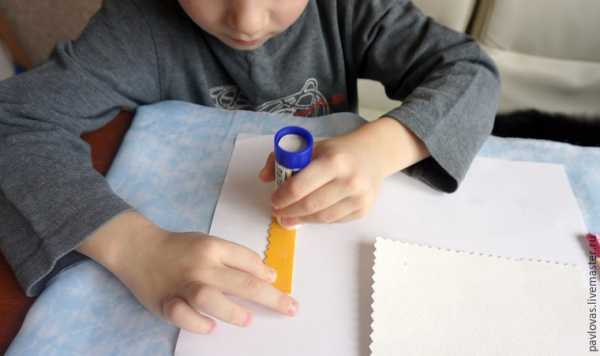 Клеим первый слой. Используем клей-карандаш. Можно выбрать и другой клей, но детям проще всего работать с клеем-карандашом, к тому же он достаточно сухой, не деформирует поверхность влагой.