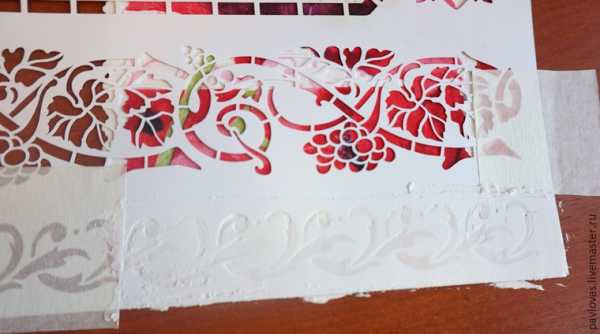 Если у вас есть структурная паста , например, «Таир» — воспользуйтесь ею, если нет — шпатлевкой по дереву, добавив в нее немного ПВА (не более 15 части) для эластичности. Консистенция должна быть без комков и хорошо размазываться мастихином, не растекаться. Кладем трафарет, можно зафиксировать края скотчем, намазываем мастихином не толстым слоем, снимаем, сушим естественным путем. Не советую сушить феном, так как паста может растрескаться.