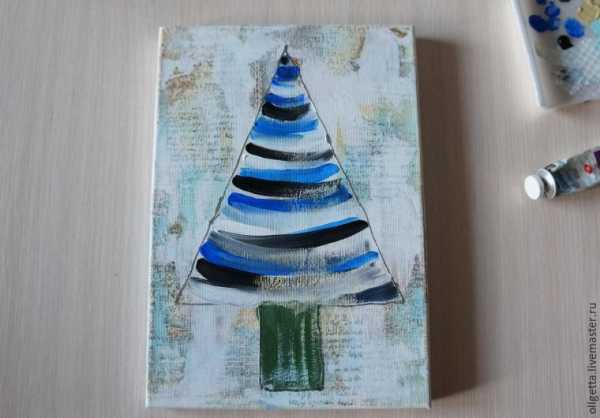 10. Добавляем звезду, вырезанную из скрапбумаги. По контуру обводим елку и звезду черной акриловой краской.