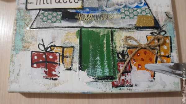 16. Внизу холста добавляем мазки текстурной пасты, чтобы наши подарки утонули в «снегу».