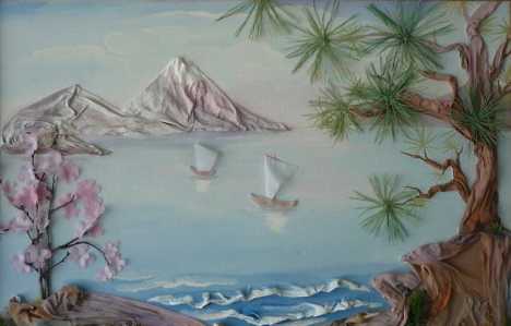 После того, как композиция сохла не менее суток, приступаем к раскрашиванию. Смешивая базовый цвет с белым, наносим выбранные тона на основу, не покрывая фигурные детали. После высыхания наносим слой лака. Затем вставляем коллаж в раму.