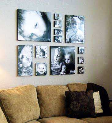 Украшать фотографиями можно любую комнату в доме, но надо учитывать особенности интерьера комнаты, чтобы стилизовать коллаж из фотографий под данный интерьер.