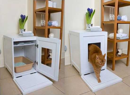 Кошачий туалет можно организовать в ванной комнате или прихожей. Пластиковый лоток – замаскировать, поместив в шкафчик или полку, предварительно сделав отверстия для входа животного. Один из недостатков размещения кошачьего туалета в ванной – необходимость постоянно держать помещение открытым. Если вы готовы пожертвовать целостностью двери, чтобы этого избежать, можно вырезать в ней небольшой лаз.