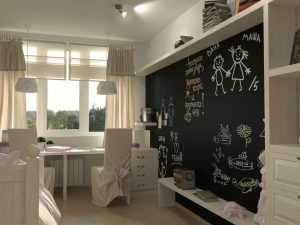 Детская спальня в стиле лофтТак как одна из функций интерьера в стиле лофт заключается в пробуждении и поддержании в детях творческого начала, уместным будет оформление одной из стен в виде грифельно-магнитной доски. На ней ребенок сможет творить в любое время, не ограничивая себя пространством альбомного листа.
