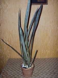 Сансевиерия считается очень выносливым и долговечным комнатным растением. Она имеет длинные жёсткие листья тёмно-зелёного цвета с горизонтальными полосками, более светлыми по тону. Это растение любит яркий свет и во время роста предпочитает умеренный полив, когда верхний слой почвы уже подсох. Зимой частота полива уменьшается, но допускать полного высыхания почвы не рекомендуется.