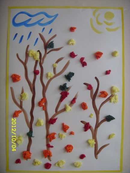 Материалы и оборудование. листа ватмана с нарисованной на нем осенней композиции: деревья без листьев, солнышко, тучи и т. п. ; бумажные салфетки зеленого, красного, желтого, оранжевого цветов (можно ограничиться желтым и красным цветом) ; клей-карандаш; клееночки и влажные салфетки на каждого ребенка.