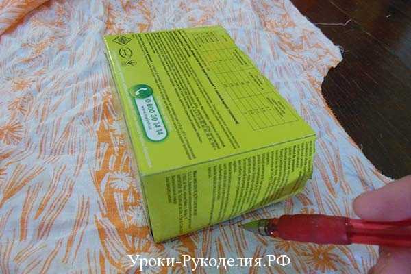 Обматываю коробку тканью и таким образом понимаю, сколько мне нужно ткани, чтобы обернуть всю кробку. И отрываю, взяв запас сантиметров 5-6.