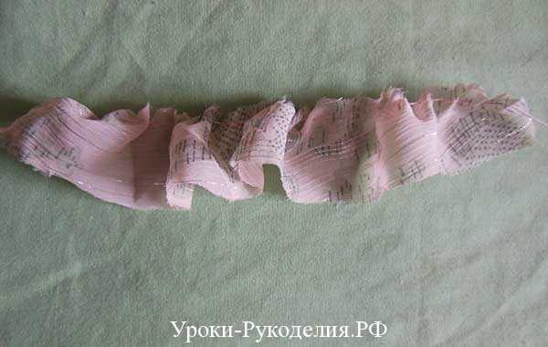 Вуалевую ткань нарезаем полосками 4-5 см и собираем с помощью иглы и нити. Также для данной цели можно использовать кусок тюли, шифона, газа, органзы и прочие лёгкие ткани.