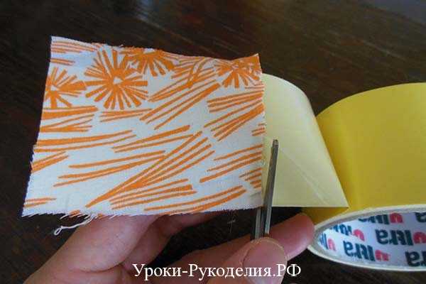 Прикладываем ткань сложенным краем к коробке и фиксируем ткань скотчем. Просто чтобы не убегала. Фиксируем по кругу небольшими кусочками скотча.А потом проходим в круг весь край ткани. Чтобы было прочно и на века, можно край предварительно проклеить клеевым пистолетом.