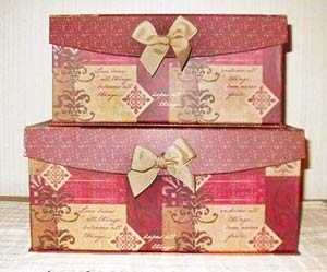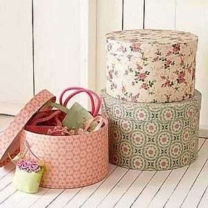 Альтернативный вариант – одинаково оформленные коробки разного размера, поставленные друг на друга и образующие пирамиду, как на фото справа. Так часто декорируют рабочее место для шитья, раскладывая по коробкам ткани, нитки и т.п.