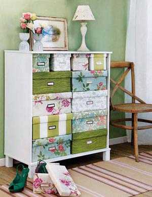 Сделать нечто подобное своими руками вы можете из обычного икеевского стеллажа или этажерки, подобрав коробки по размеру, приклеив на них обычные дешевые мебельные ручки и раскрасив по вашему вкусу. А если вы не умеете рисовать, то оклейте коробки остатками обоев, как на фото слева, и у вас получится очень оригинальный комод для хранения всякой мелочи.