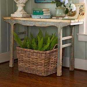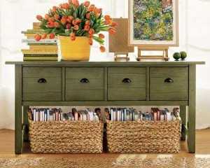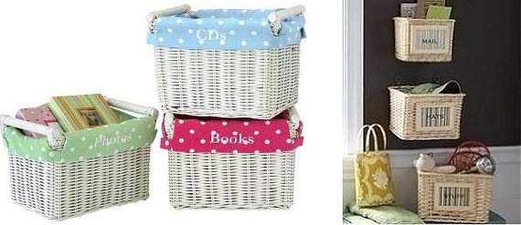 Декоративные корзины очень уместны на даче, если вы хотите придать вашему дачному домику рустикальный акцент, как на фото слева. А в городской квартире из небольших декоративных корзин можно сделать отличный органайзер, как на фото ниже.