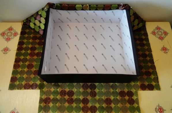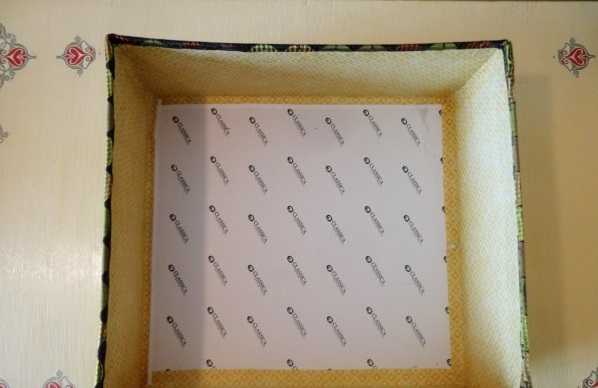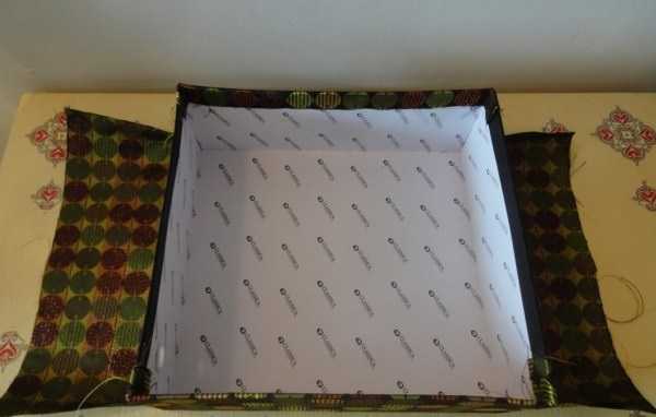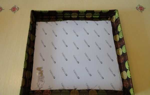 Возьмем простую картонную коробку подходящего размера, которого будет достаточно, чтобы поместить ее в ящик комода для белья. Оклейте коробку любой тканью на ваш выбор, чтобы коробка смотрелась красиво. Сделать это можно по технологии, представленной на фото ниже. Цвет ткани выбирайте индивидуально по вашему решению. Клеить ткань на коробку следует при помощи клея ПВА.