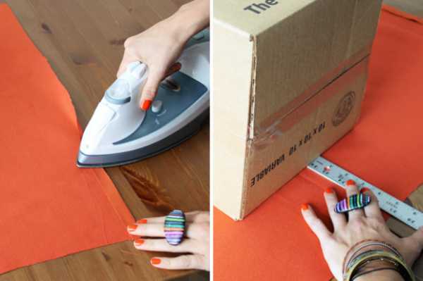 Погладьте ткань перед раскроем. Авторы использовали три имеющихся у них коробки. Начнём работу с обтяжки десятидюймовой коробки (25см)