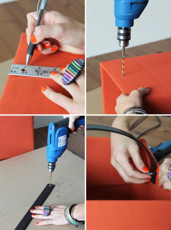 Приложите ремень к коробке. Отметьте, куда вы будете его крепить. Отрежьте нужную длину и прикрепите ремень при помощи сверла.