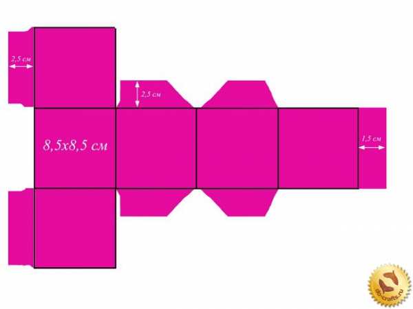 Квадратная упаковка наиболее часто используется. Варианты бывают разные, как цельные, так и состоящие из двух деталей — основы и крышки. Проще делать коробки из одной детали. Закрываться такая упаковка может на завязках или с помощью картонного «язычка», уходящего в прорезь в противоположной части коробочки. Ниже представлен простой вариант упаковки в форме кубика.
