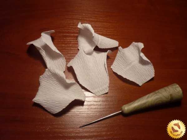 Закруглённый край аккуратно растягиваем до образования волн, затем при помощи шила или зубочистки подкручиваем края лепестков назад.