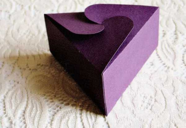Поместить подарок на внутренний треугольник и склеить коробку. Если припуски для скрепления деталей не вырезаны, проколоть по каждому краю маленькие дырочки и продеть сквозь них ленточку.