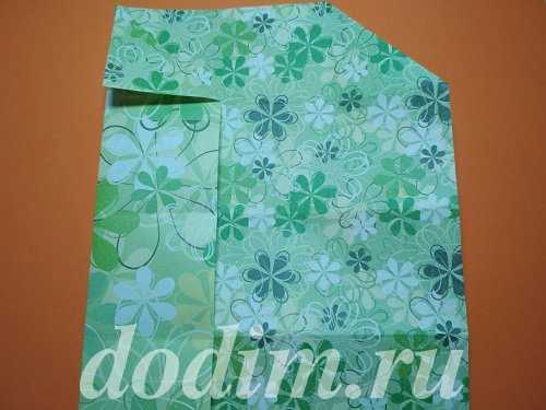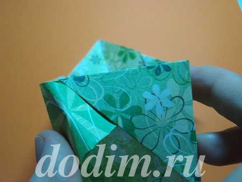 Осталось сделать вторую стенку. Для этого нам нужны небольшие диагональные складки по бокам. По ним сложите оставшийся участок бумаги, подняв вверх край листа. Острые концы спрячьте в кармашки, образовавшиеся на боковых сторонах коробочки. Таким образом, она не распадётся и приобретет прямоугольную форму.