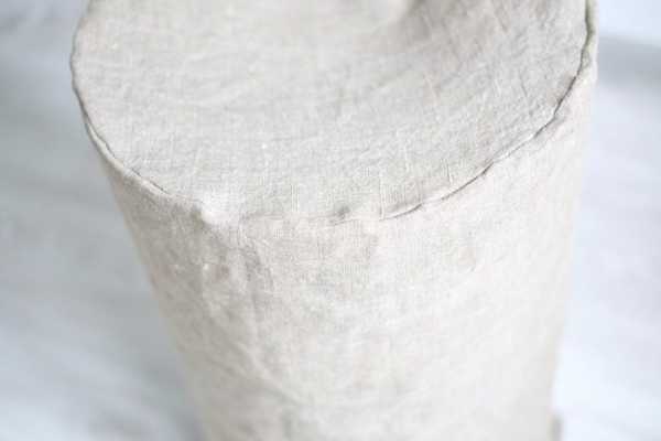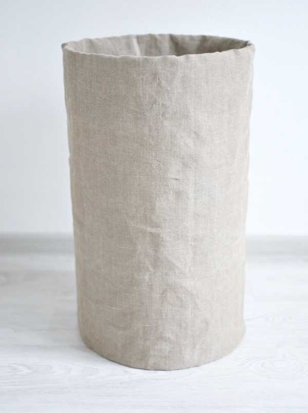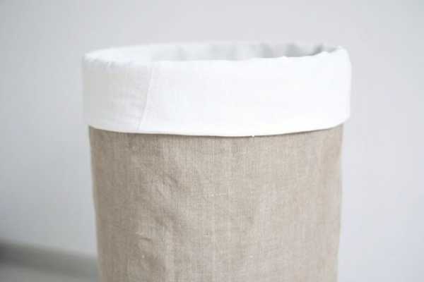 Вырезаем из светлого льна отрез 65 х 102 см. Повторяем все те же действия, что и с серым льном. Помещаем готовый чехол в корзину для белья изнанкой внутрь. Так как высота светлого чехла больше, осталось достаточно ткани, чтобы завернуть ее на внешнюю сторону корзины. В качестве декора края можно использовать хлопковое кружево, помпоны или тесьму.