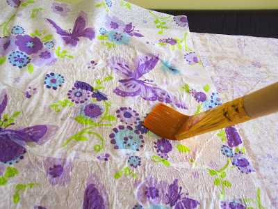 8. Далее приклеиваем последний, красивый слой. Также делаем складки. Промазываем клеем прямо сверху салфеток, чтобы они полностью промокли и посильнее нажимаем кистью.