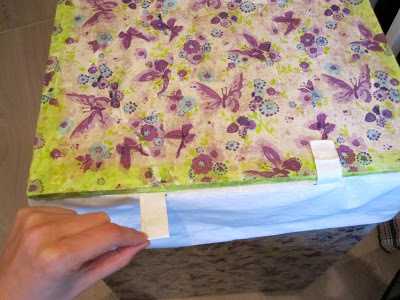 6. Приклеиваем первый слой салфеток клеем ПВА. Я себе усложнила задачу, можно было просто покрасить ящик белой краской и приклеить цветные салфетки!