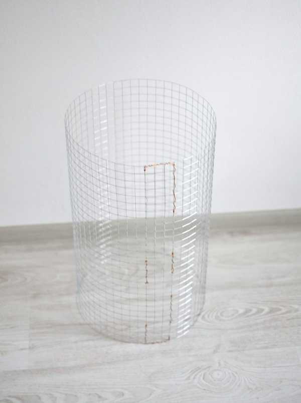 Для изготовления такой корзины понадобится каркас. В качестве каркаса можно использовать металлическую мелкоячеистую сетку. Она продается в рулонах, поэтому после того, как вы отрежете нужное количество, сетка сама примет цилиндрическую форму. Ширина сетки задает высоту корзины, а длина – диаметр. Ориентироваться нужно на требуемые объемы, в среднем метра сетки хватит, чтобы сделать корзину диаметром 50 см. На эти цифры и нужно оглядываться, делая корзину немного больше или наоборот – поменьше.