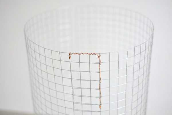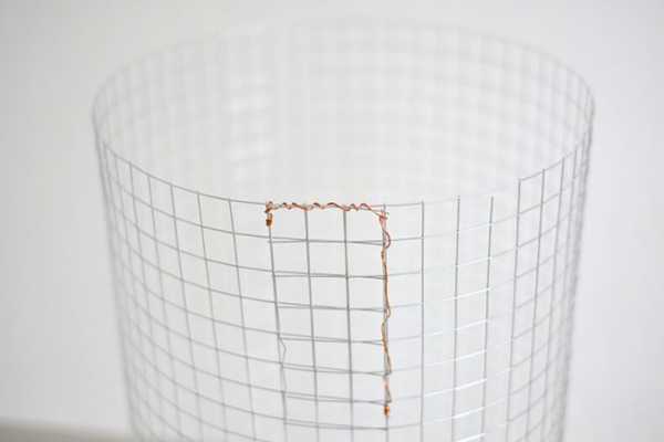 Из сетки необходимо вырезать прямоугольник с высотой, которая вас устроит, и шириной, равной окружности основания из дерева. Для дальнейшего скрепления оставьте вдоль остова небольшие отрезки ‒ они вам помогут при скреплении шва. Затем короткой стороной оберните круг, оставляя припуск 6 сантиметров. Теперь вертикальный шов, образовавшийся сбоку будущей корзины, аккуратно закрепите, загнув короткие отрезки. Далее подогните припуски сетки под дно конструкции и зафиксируйте шурупами, прикрепив к деревянному кругу.