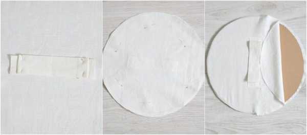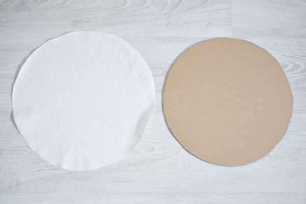 Теперь приступаем к изготовлению крышки. Ее основу можно сделать из картона, тонкого пластика или плотной подложки под ламинат. Вырезаем круг диаметром 32 см. Готовим 2 круга из белой ткани, по диаметру равных картонной заготовке плюс 2 см на припуски.