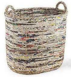 Корзина из бельевой веревкиДля бельевой веревке лучше так же использовать каркас. Чем толще и грубее будет веревка, тем краше и органичнее получится конечный продукт. В качестве каркаса проще всего взять пластиковую корзину для офисного мусора. Затем клеевым пистолетом конец веревки приклеивается к нижней части боковой стенки корзины и плотно ряд к ряду наматывается на корзину. Веревку постоянно проклеивают клеевым пистолетом, иначе она запросто может развалится через какое-то время.