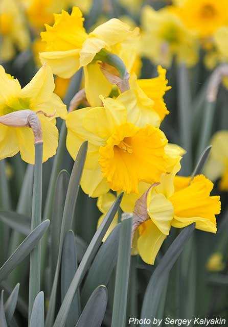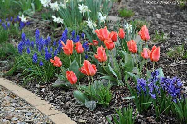 2. Если хочется высадить тюльпаны, нарциссы или гиацинты в цветники с многолетниками, то лучше выделить им место во втором ряду – на первом плане неприглядные отцветающие луковичные растения будет невозможно замаскировать. Посадка на самом виду всё же возможна, но она более затратна и трудоемка: придется выкопать луковичные сразу после отцветания (а не как положено, когда завянут листья) и положить их в сухое тенистое место, присыпав землей. На их место в цветнике высаживают летники. После того, как листья и стебли выкопанных тюльпанов, гиацинтов и т.д. окончательно завянут, луковицы хранят, соблюдая соответствующие температурные режимы для каждого вида.