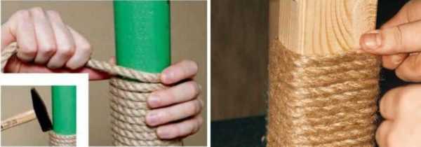 Подготовленные отрезки пластиковых труб плотно обматывают джутовой веревкой. Витки должны ложиться так, чтобы между ними не было видно пластмассы. Концы веревки прочно закрепляют на трубе. Кошка не должна оторвать их, когда будет точить когти. Если столбик получается высоким, то крепить веревку нужно через каждые 10 сантиметров. Трубу фиксируют на крыше домика или рядом с ним, на фанере.
