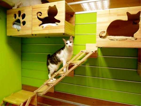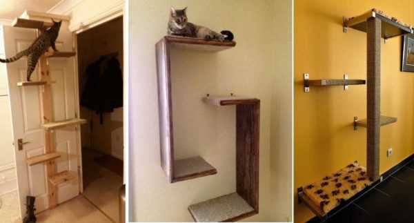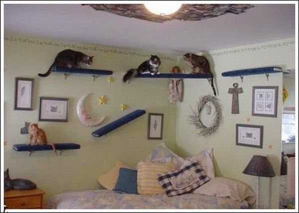 Даже не самый большой дом для кошки занимает около метра свободного пространства на полу. Выделить такое пространство не всегда возможно. Для таких случаев есть настенные варианты кошачьих уголков. Домики и площадки крепятся к стене в выбранном месте любым доступным методом. Где напрямую — гвоздями к стене, где-то при помощи кронштейнов. Между закрепленными частями делают переходы. Из досок — прямых и наклонных, веревочных лестниц, набивают перекладинки на расстоянии 10-15 см друг от друга, делают ступеньки в виде лесенки… В общем, все ограничивается лишь вашей фантазией.