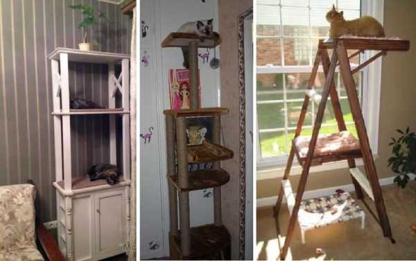 Сделать кошачью лежанку в виде этажерки — интересная идея. Так же как кошачью лазалку из стремянки