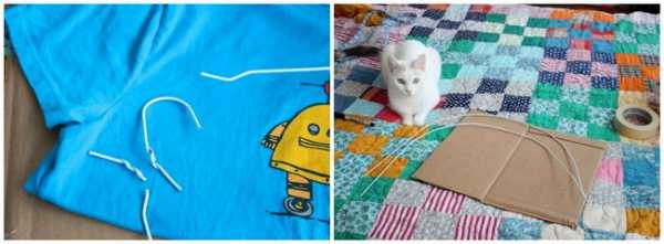 А вот несколько вариантов текстильных кошачьих домиков, сшитых из старых вещей. Для взрослого кота едва ли такой домик подойдет, а вот для котят, как временная база, будет очень неплохим и уютным убежищем. Самый простой вариант — домик из старой футболки, собранный по принципу палатки. Два прута, скреплённых по центру накрест, фиксируют четырьмя опорами к круглому каркасу, тоже из прутьев или проволоки. Размер конструкции должен быть таким, чтобы намеченная футболка обтягивала каркас, а горловина служила входом. Нижняя часть футболки просто зашивается, в результате получаем уютную кошачью палатку. Для подстилки можно взять любую ткань или поролон, а если там будут отдыхать котята, то днище можно сшить из меха.