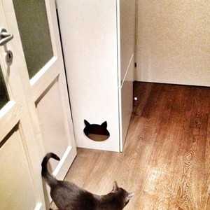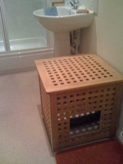 О, ИКЕА, что бы мы без тебя делали? В этот раз мы взяли один из простых белых шкафов, вырезали отверстие в боковой стороне и установили клапан для дополнительного контроля запаха. Вы бы никогда не догадались, что это ящик для кошачьего туалета.