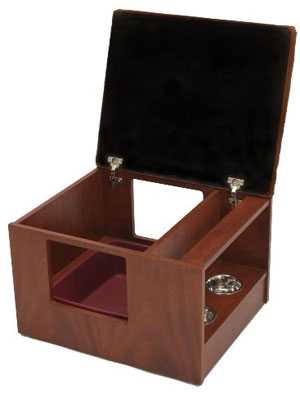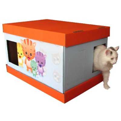 Чтобы сделать такой ящик для кошки, не нужно особых навыков. Просто соедините два деревянных ящика вместе и вырежьте проем достаточный по размеру, чтобы котенку было комфортно зайти. Если закрепить при помощи шарниров, то конструкция получится более удобной.