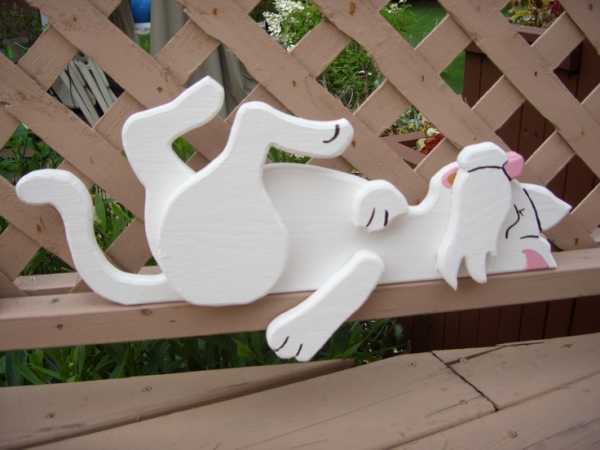 Любители кошек, оценят предложение по достоинству, помимо живых питомцев появятся еще и деревянные собратья, которые прекрасно украсят садовый участок или балконные растения. Эти деревянные фигурки можно выпилить лобзиком из фанеры, затем расписать их акриловыми красками и покрыть сверху акриловым лаком.
