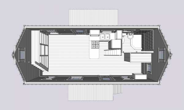 Кухня находится примерно посередине жилища и объединена с открытой гостиной.