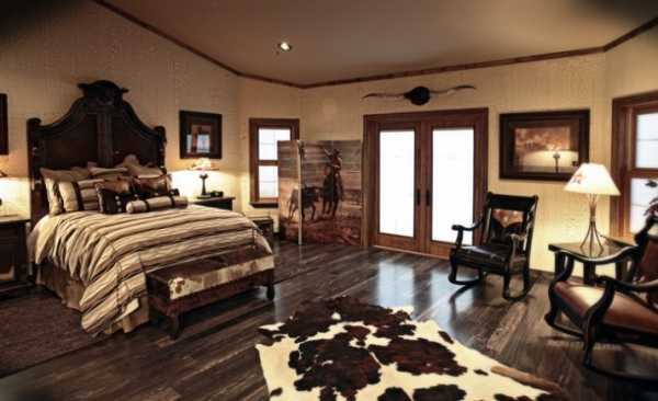 В спальне устанавливают массивную деревянную кровать, ковбойский стиль подчёркивают подковы, перевёрнутые вверх на счастье и удачу. Шторы и покрывала берут яркие, обычно сочетающие несколько насыщенных, густых оттенков.