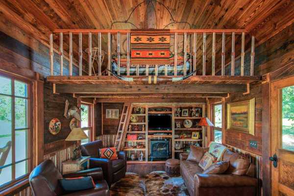 Если у Вас собственный дом из деревянного бруса, ковбойский стиль можно легко создать, если не зашивать ничем стены, а обработать дерево жидкостями от вредителей и плесени, а затем покрыть лаком.