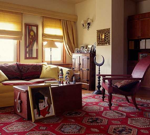 Мелкие аксессуары отлично соседствуют с коврами-килимами. Что же касается крупных предметов мебели, — придется выбирать — либо ковер, либо сундук, если, конечно, вы не стремитесь к импровизации на тему восточного шатра.